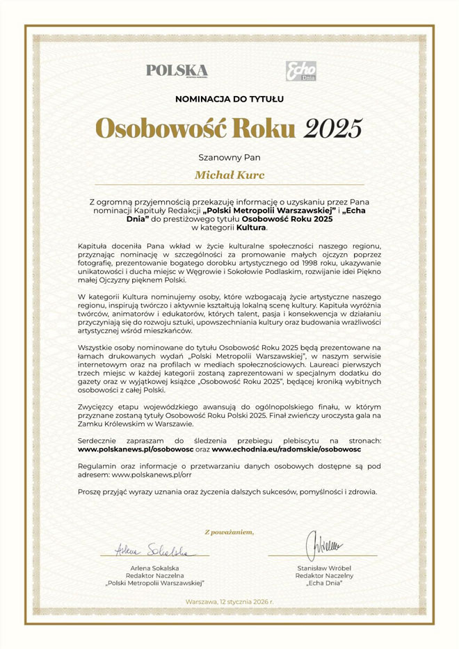 Kapituła doceniła Pana wkład w życie kulturalne społeczności naszego regionu, przyznając nominację w szczególności za promowanie małych ojczyzn poprzez fotografię, prezentowanie bogatego dorobku artystycznego od 1998 roku, ukazywanie unikatowości i ducha miejsc w Węgrowie i Sokołowie Podlaskim, rozwijanie idei Piękno małej Ojczyzny pięknem Polski.