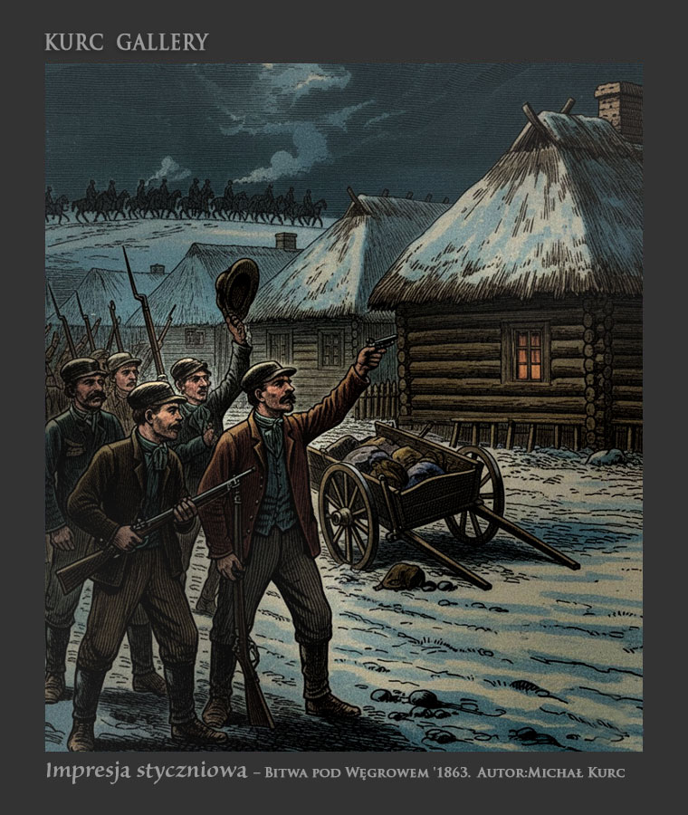 AI Galeria na stronie Michała Kurca, zatytułowana „Bitwa pod Węgrowem 1863 – w cyfrografii (AI)”, to unikalny projekt artystyczny, który łączy historyczną pamięć o Powstaniu Styczniowym z nowoczesnymi technologiami generowania obrazu. Autor określa tę kolekcję mianem „impresji styczniowej”