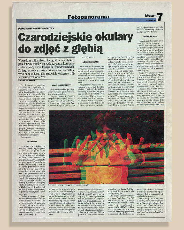 komputera do wykonywania fotografii trójwymiarowych. Za jego pomocą można tak obrobić normalnie wykonane zdjęcia, aby sprawiały wrażenie trójwymiarowych obrazów.