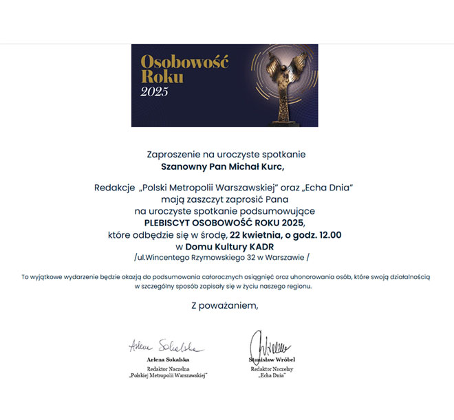 Z ogromną przyjemnością przekazuję informację o uzyskaniu przez Pana nominacji Kapituły Redakcji „Polski Metropolii Warszawskiej" i „Echa Dnia" do prestiżowego tytułu Osobowość Roku 2025 w kategorii Kultura.